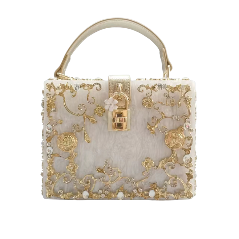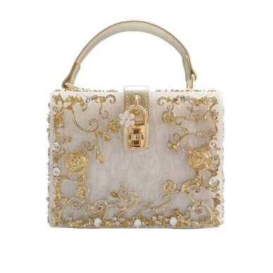 Mercurius Çantanın modern zarafetini keşfedin. Bu çanta kutu şeklindeki silüeti ve altın kaplama çiçek süslemeleriyle lüksü yeniden tanımlıyor. Şık tasarımı ve güvenli çevirme kilidi bir miktar sofistikelik katıyor. Çağdaş bir kıyafet için mükemmel olan bu çanta, stil ve işlevi zahmetsizce harmanlayan yapısal bir harikadır.